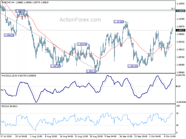 EUR/CHF’s rebound from 1.0832 resumes as consolidation from 1.0811 extends. Further rise could be seen but still, upside should be limited by 1.1062 cluster resistance (38.2% retracement of 1.1476 to 1.0811 at 1.1065). On the downside, sustained break of 1.0811 will resume larger down trend and target 1.0629 key support next.