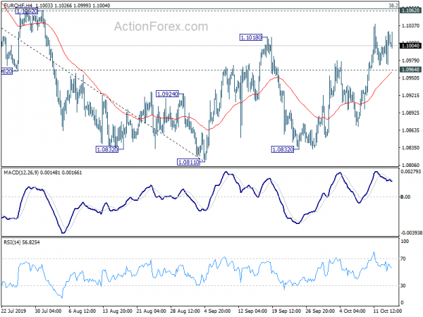 Intraday bias in EUR/CHF remains neural and outlook is unchanged. Consolidation from 1.0811 might extend. But upside should be limited by 1.1062 cluster resistance (38.2% retracement of 1.1476 to 1.0811 at 1.1065). On the downside, below 1.0964 minor support will turn bias back to the downside for retesting 1.0811. However, sustained break of 1.1062/5 will carry larger bullish implication and bring stronger rise.