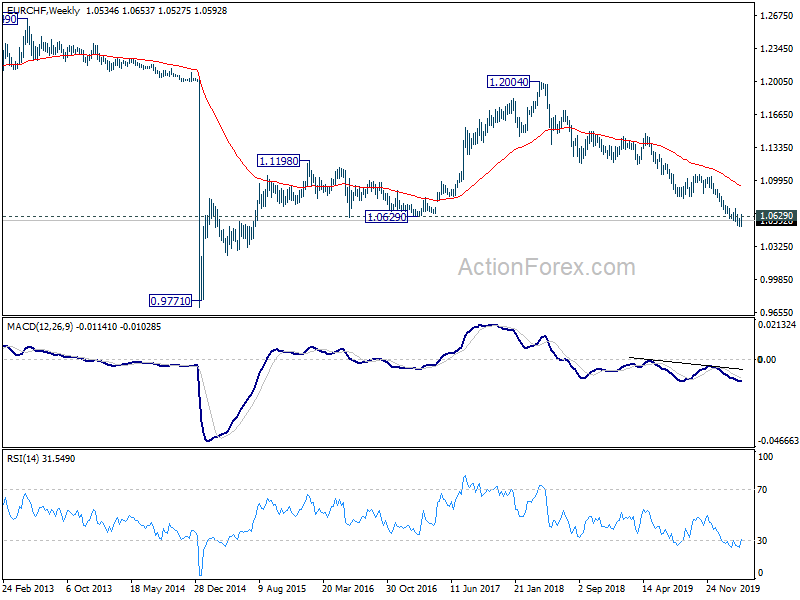 In the bigger picture, down trend from 1.2004 is (2018 high) is still in progress. Sustained break of 1.0629 will pave the way to parity next. In any case, outlook will remain bearish as long as 1.0811 support turned resistance holds, in case of rebound. However, considering bullish convergence condition in daily MACD, firm of 1.0811 resistance will indicate medium term bottoming.