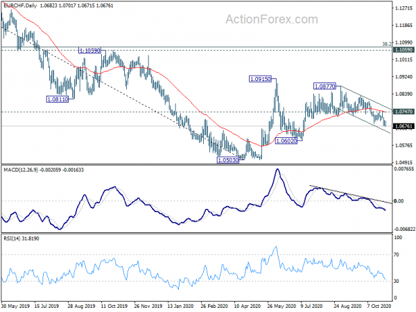 EUR/CHF’s decline resumed by taken out 1.0688 last week. Initial bias stays on the downside this week for further decline. Fall from 1.0877 is seen as the third leg of the pattern from 1.0915. Deeper fall should be seen to 1.0602 support next. On the upside, break of 1.0747 resistance is needed to signal short term bottoming. Otherwise, outlook will stay bearish in case of recovery.