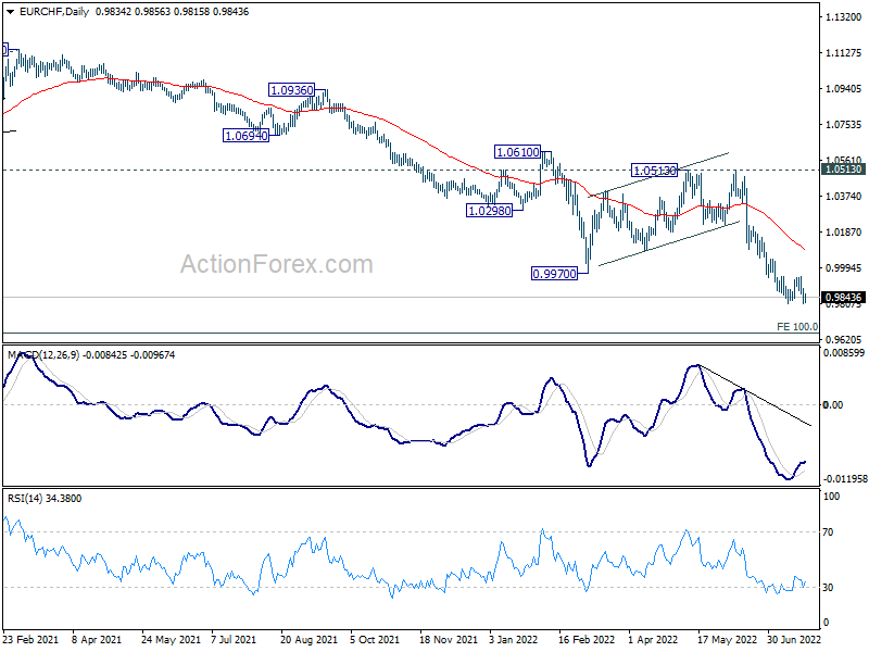 EUR/CHF recovers ahead of 0.9804 support and intraday b9ias remains neutral. Outlook remains bearish with 0.9953 resistance intact. On the downside, break of 0.9804 will resume larger down trend. Next target is 0.9650 long term projection level. On the upside, however, break of 0.9953 minor resistance will suggest short term bottoming, and bring stronger rebound to 55 day EMA (now at 1.0088).
