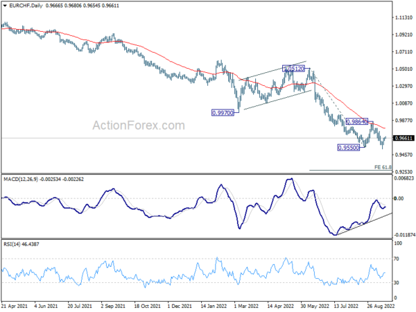 Intraday bias in EUR/CHF stays neutral as recovery from 0.9530 extends. But outlook remains bearish with 0.9864 resistance intact. On the downside, break of 0.9530 will extend larger down trend to 61.8% projection of 1.0512 to 0.9550 from 0.9864 at 0.9269.