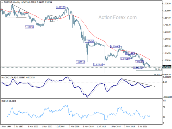 In the bigger picture, down trend from 1.2004 (2018 high) is still in progress. Decisive break of 0.9407 will confirm resumption, and target 61.8% projection of 1.1149 to 0.9407 from 1.0095 at 0.9018. On the upside, break of 0.9691 resistance is needed to be the first sign of medium term bottoming. Otherwise, outlook will stay bearish.