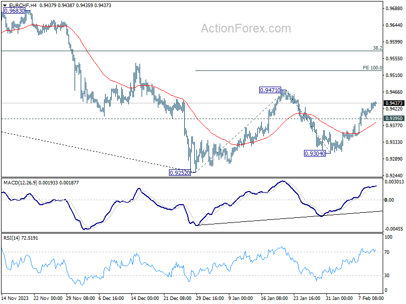 Intraday bias in EUR/CHF remains on the upside for 0.9471 resistance first. Firm break there will resume whole rebound from 0.9252. Next target is 100% projection of 0.9252 to 0.9471 from 0.9304 at 0.9523. On the downside, below 0.9376 minor support will turn intraday bias neutral first.