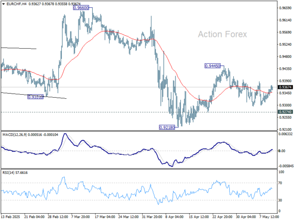 Range trading continues in EUR/CHF and intraday bias remains neutral. On the upside, above 0.9445 will resume the rebound from 0.9218, either as a corrective move or the third leg of the pattern from 0.9204. However, break of 0.9274 will suggest that that recovery has completed, and bring retest of 0.9204/18 support zone.