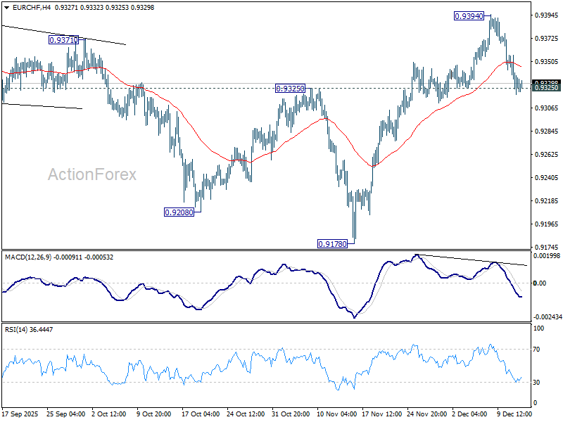 Intraday bias in EUR/CHF remains neutral for the moment. Further rise is expected with 0.9325 support intact. On the upside, above 0.9394 will resume the rebound from 0.9178 to 0.9452 key structural resistance. Decisive break there will carry larger bullish implications. Nevertheless, firm break of 0.9325 will bring deeper fall through 55 D EMA (now at 0.9313) and below.