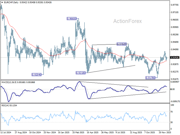 Intraday bias in EUR/CHF stays neutral for the moment, and more consolidations could be seen. On the upside, break of 0.9394 will resume the rebound from 0.9178 to 0.9452 structural resistance. Decisive break there will carry larger bullish implications. However, firm break of 0.9311 support will argue that the rebound has completed, and turn bias back to the downside for retesting 0.9178 low.