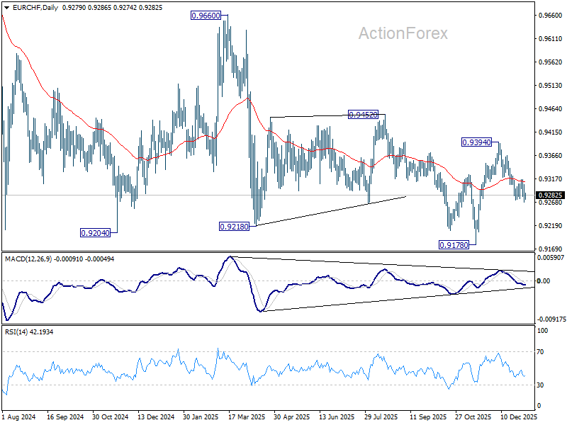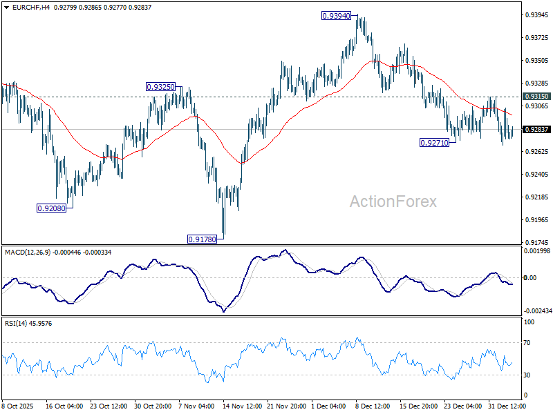Intraday bias in EUR/CHF stays neutral and more consolidation could be seen. But further fall is expected as long as 0.9315 resistance holds. Firm break of 0.9271 will resume the fall from 0.9394. Next target should be a retest of 0.9178 low. However, firm break of 0.9315 will bring stronger rise back to retest 0.9394 resistance.