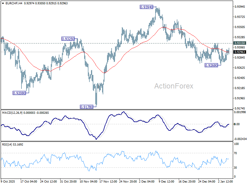 No change in EUR/CHF’s outlook and intraday bias stays neutral for more consolidations. Further fall is expected as long as 0.9315 resistance holds. Firm break of 0.9268 will resume the fall from 0.9394. Next target should be a retest of 0.9178 low. However, firm break of 0.9315 will bring stronger rise back to retest 0.9394 resistance.