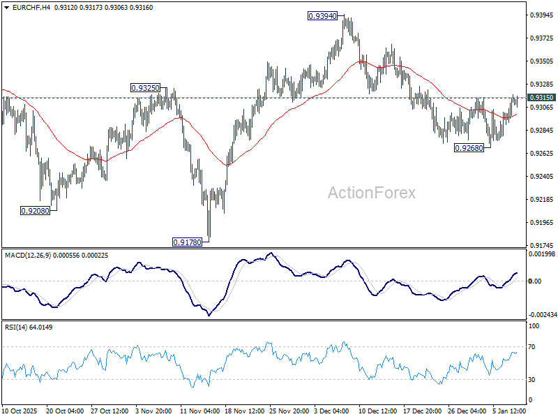 Intraday bias in EUR/CHF remains neutral with immediate focus on 0.9315 resistance. Firm break there will argue that pullback from 0.9394 has completed at 0.9268 already. Intraday bias will then be back on the upside for retesting 0.9394. Nevertheless, rejection by 0.9315 will keep near term risk on the downside. Break of 0.9268 will resume the fall from 0.9394 to retest 0.9178 low.