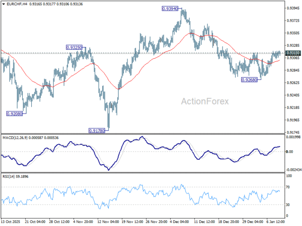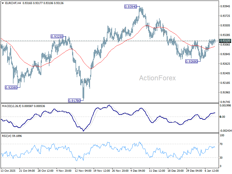Intraday bias in EUR/CHF stays neutral at this point, and immediate focus remains on 0.9315 resistance. Firm break there will argue that pullback from 0.9394 has completed at 0.9268 already. Intraday bias will then be back on the upside for retesting 0.9394. Nevertheless, rejection by 0.9315 will keep near term risk on the downside. Break of 0.9268 will resume the fall from 0.9394 to retest 0.9178 low.
