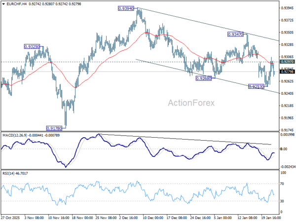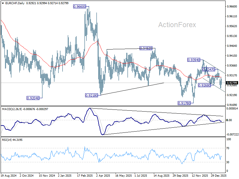Intraday bias in EUR/HF is turned neutral first with breach of 0.9297 minor resistance. Another fall will remain mildly in favor as long as 0.9347 resistance holds. Below 0.9253 will extend the decline from 0.9394 towards 0.9178 low. Nevertheless, firm break of 0.9347 will indicate that fall from 0.9394 has completed as a correction, and bring stronger rally to retest this resistance.