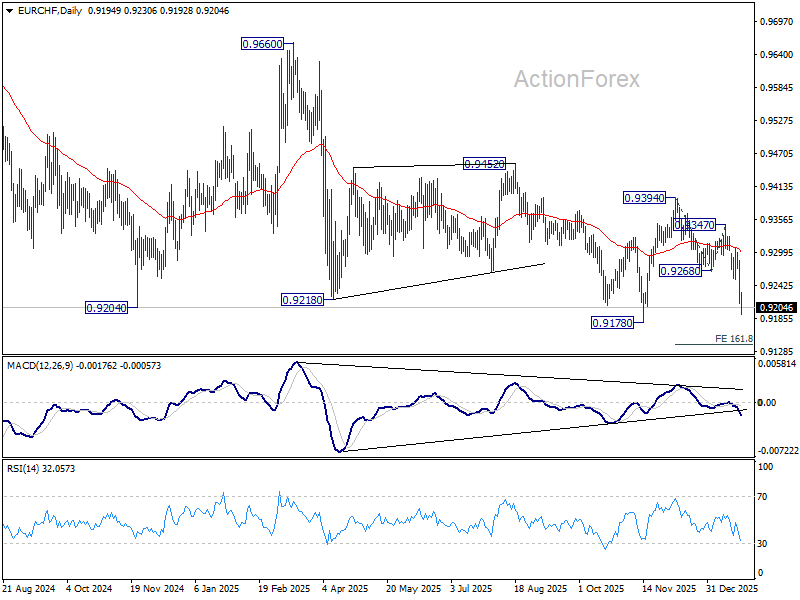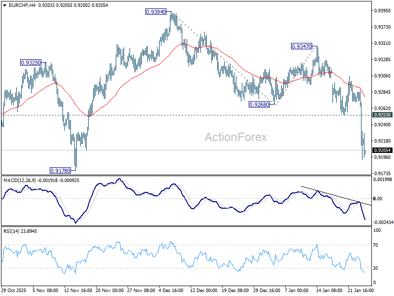 Intraday bias in EUR/CHF stays on the downside for retesting 0.9178 low. Firm break there will resume larger down trend. On the upside, above 0.9253 support turned resistance will turn intraday bias neutral and bring consolidations, before staging another decline.