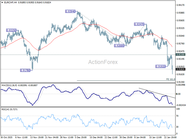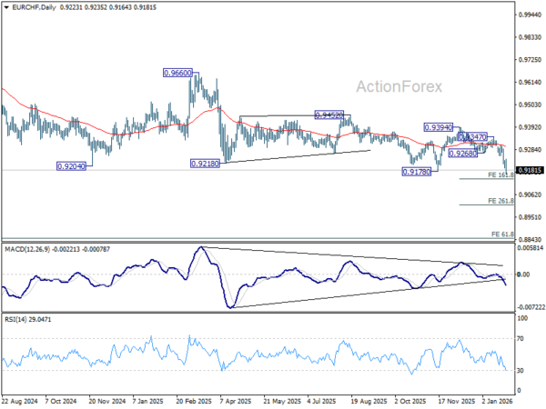EUR/CHF’s fall resumed after brief consolidations. Break of 0.9178 suggests larger down trend resumption too. Intraday bias is back on the downside for 161.8% projection of 0.9394 to 0.9268 from 0.9347 at 0.9143. Firm break there will target 261.8% projection at 0.9017. On the upside, above 0.9235 minor resistance will turn intraday bias neutral again and bring consolidations first, before staging another fall.