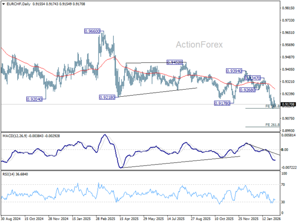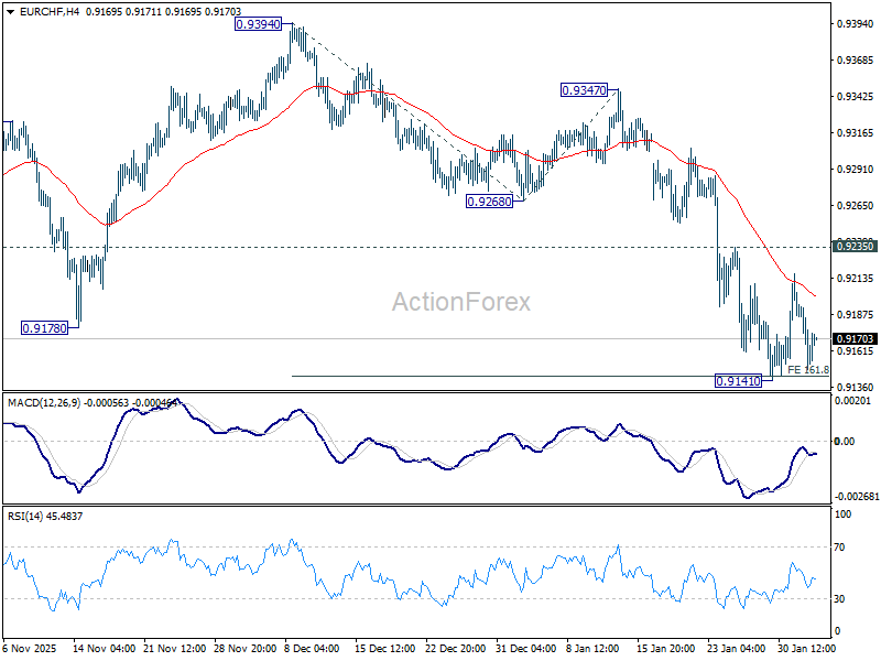 Intraday bias in EUR/CHF stays neutral for the moment. Consolidations from 0.9141 could extend further, but upside should be limited by 0.9235 to bring another fall. Decisive break of 0.9141 will extend larger down trend to 261.8% projection of 0.9394 to 0.9268 from 0.9347 at 0.9143. However, firm break of 0.9235 resistance will suggest short term bottoming and bring stronger rebound to 55 D EMA (now at 0.9274).