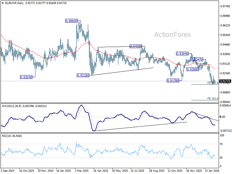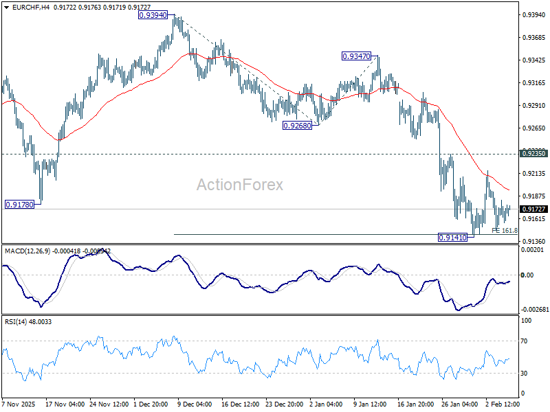 Intraday bias in EUR/CHF remains neutral for more consolidations above 0.9141. Upside should be limited by 0.9235 to bring another fall. Decisive break of 0.9141 will extend larger down trend to 261.8% projection of 0.9394 to 0.9268 from 0.9347 at 0.9143. However, firm break of 0.9235 resistance will suggest short term bottoming and bring stronger rebound to 55 D EMA (now at 0.9267).