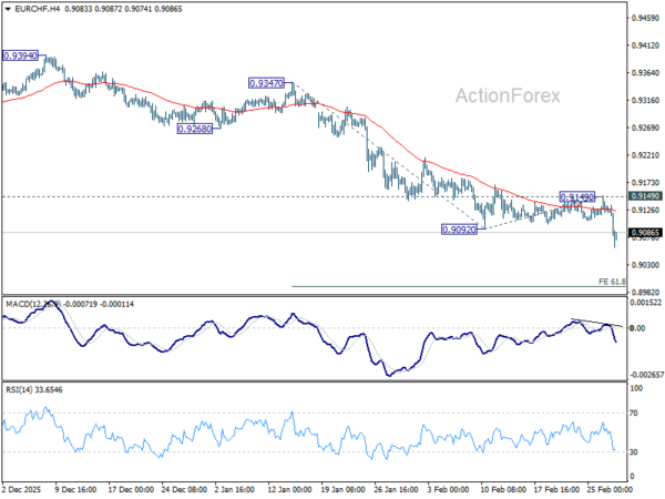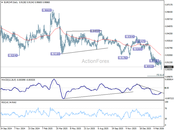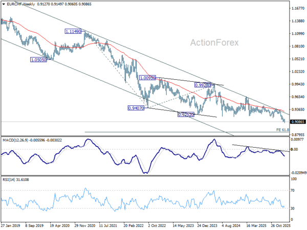 EUR/CHF’s down trend resumed by late break of 0.9092 support last week. Initial bias is back on the downside. Next target is 61.8% projection of 0.9347 to 0.9092 from 0.9149 at 0.8991. For now, near term outlook will stay bearish as long as 0.9149 resistance holds, in case of recovery.