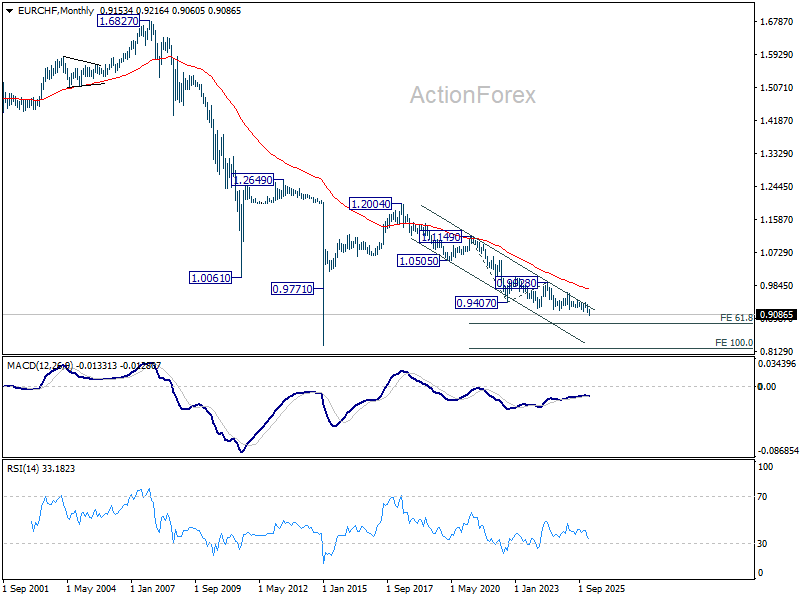 In the bigger picture, down trend from 0.9928 (2024 high) is still in progress. Next target is 61.8% projection of 1.1149 to 0.9407 from 0.9928 at 0.8851. Outlook will stay bearish as long as 0.9394 resistance holds, in case of rebound.