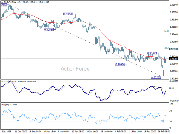 Intraday bias in EUR/CHF remains neutral for the moment. Price actions from 0.9026 short term bottom are viewed as a consolidations pattern only. While stronger recovery cannot be ruled out, upside should be limited by 0.9168 cluster resistance (38.2% retracement of 0.9394 to 0.9026 at 0.9167). Another fall below 0.9026 to resume the larger down trend is expected at a later stage. However, decisive break of 0.9167/8 will bring stronger rebound to 55 D EMA (now at 0.9197) and possibly above.
