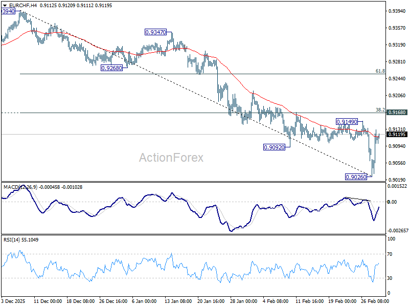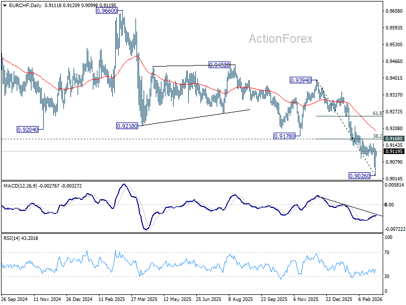 Intraday bias in EUR/CHF remains neutral for the moment. Price actions from 0.9026 short term bottom are viewed as a consolidations pattern only. While stronger recovery cannot be ruled out, upside should be limited by 0.9168 cluster resistance (38.2% retracement of 0.9394 to 0.9026 at 0.9167). Another fall below 0.9026 to resume the larger down trend is expected at a later stage. However, decisive break of 0.9167/8 will bring stronger rebound to 55 D EMA (now at 0.9197) and possibly above.