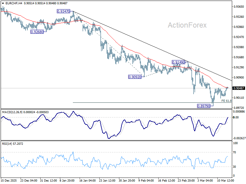 EUR/CHF is extending consolidations pattern from 0.8979 and intraday bias stays neutral. Near term outlook remains bearish with 0.9149 resistance intact. On the downside, below 0.8979 will extend the larger down trend to 100% projection of 0.9347 to 0.9092 from 0.9149 at 0.8894.