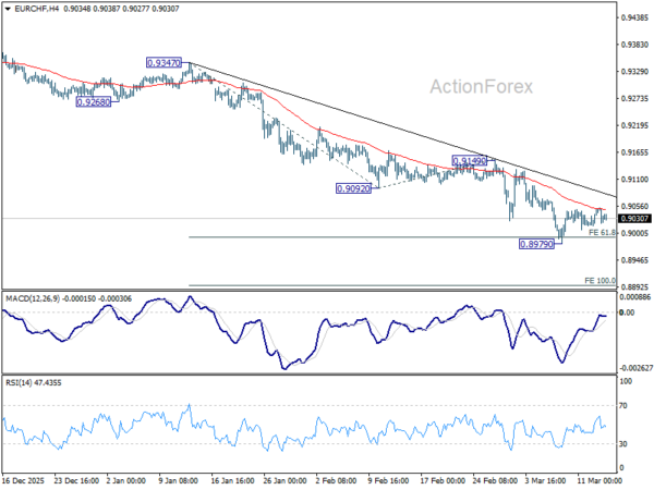 EUR/CHF edged lower to 0.8979 last week but quickly recovered. Initial bias remains neutral this week for some more consolidations first. But risk will stay on the downside as long as 0.9092 support turned resistance holds. On the downside, firm break of 0.8979 will resume larger down trend to 100% projection of 0.9347 to 0.9092 from 0.9149 at 0.8894.