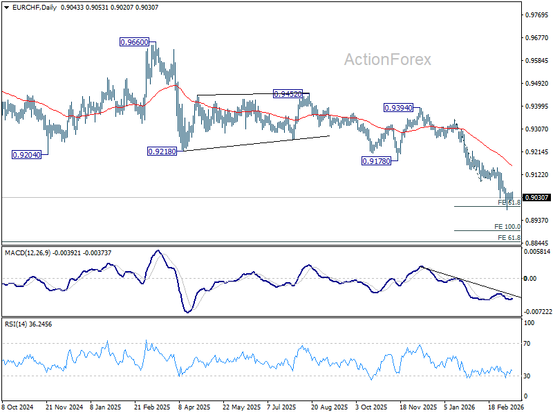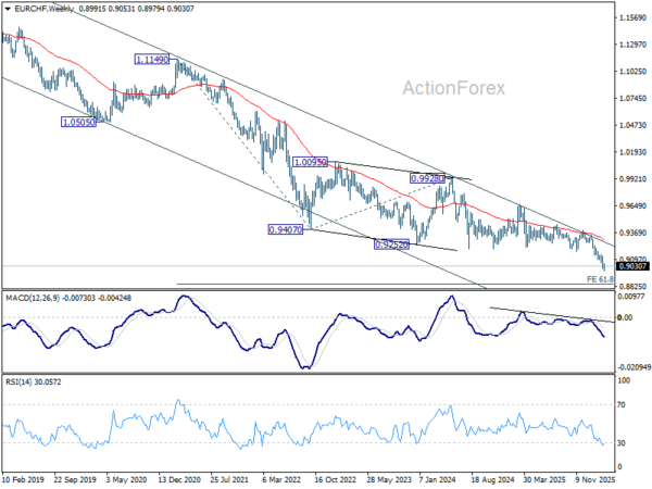 In the bigger picture, down trend from 0.9928 (2024 high) is still in progress. Next target is 61.8% projection of 1.1149 to 0.9407 from 0.9928 at 0.8851. Outlook will stay bearish as long as 0.9394 resistance holds, in case of rebound.