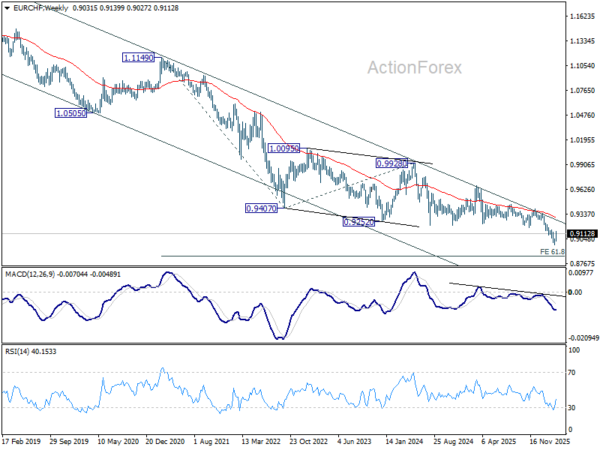 In the bigger picture, down trend from 0.9928 (2024 high) is still in progress. Next target is 61.8% projection of 1.1149 to 0.9407 from 0.9928 at 0.8851. Outlook will stay bearish as long as 0.9394 resistance holds, in case of rebound.
