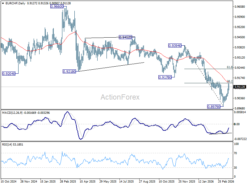 EUR/CHF’s extended rebound last week confirms short term bottoming 0.8979. But a temporary top was formed after hitting 38.2% retracement of 0.9394 to 0.8979 at 0.9138. Initial bias is turned neutral this week first. On the upside, firm break of 0.9138/9 will target 61.8% retracement at 0.9235. On the downside, below 0.9067 minor support will turn intraday bias back to the downside for retesting 0.8979 low instead.
