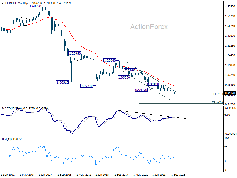In the bigger picture, down trend from 0.9928 (2024 high) is still in progress. Next target is 61.8% projection of 1.1149 to 0.9407 from 0.9928 at 0.8851. Outlook will stay bearish as long as 0.9394 resistance holds, in case of rebound.
