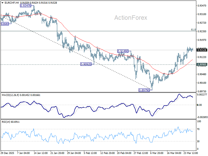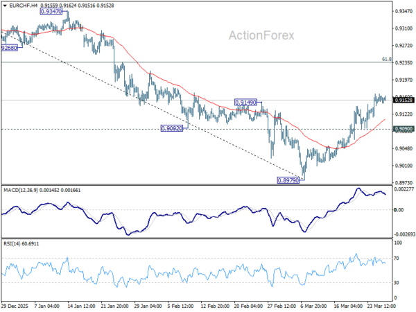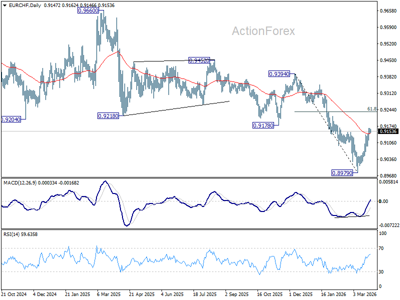 Intraday bias in EURCHF stays on the upside at this point. Rebound from 0.8979 short term bottom should target 61.8% retracement of 0.9394 to 0.8979 at 0.9235 next. On the downside, below 0.9090 minor support will turn intraday bias neutral again first.
