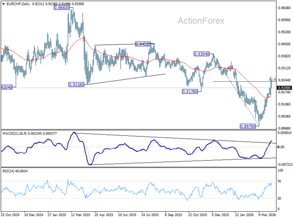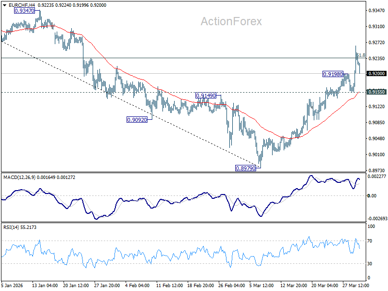 EUR/CHF’s rebound from 0.8979 resumed by breaking through 0.9198 temporary top. Intraday bias is back on the upside. Sustained trading above 61.8% retracement of 0.9394 to 0.8979 at 0.9235 will pave the way to 0.9394 key resistance next. On the downside, below 0.9155 minor support will turn intraday bias neutral first.
