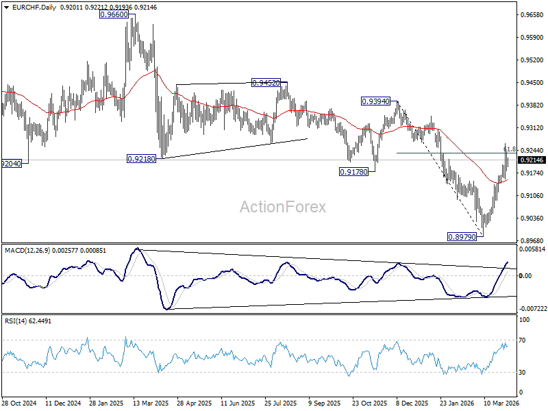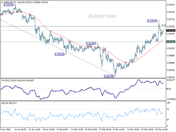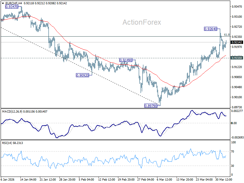 Intraday bias in EUR/CHF is turned neutral first with current retreat. On the upside, sustained trading above 61.8% retracement of 0.9394 to 0.8979 at 0.9235 will pave the way to 0.9394 key resistance next. However, break of 0.9155 support will turn bias back to the downside for 0.8979 low.
