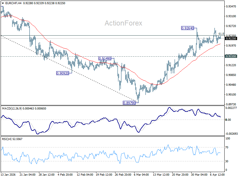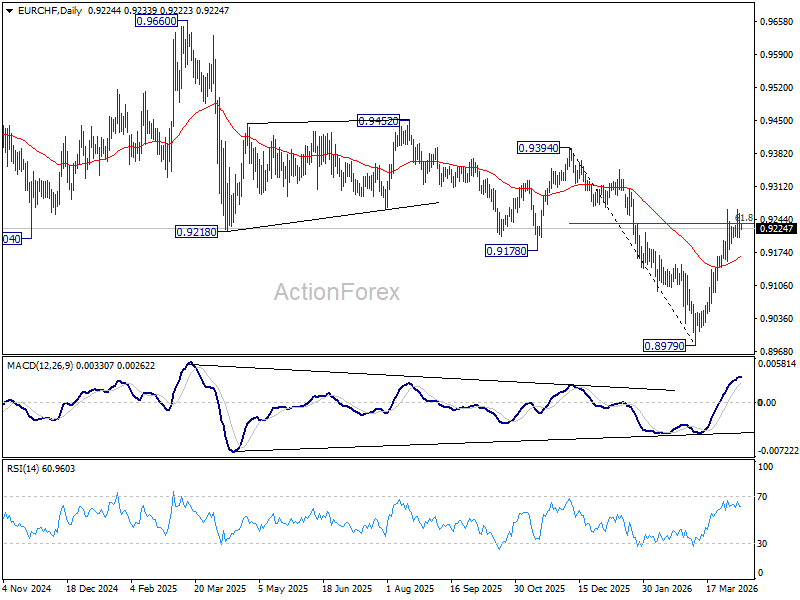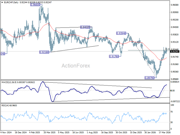 Intraday bias in EUR/CHF remains neutral at this point, and more consolidations would be seen first. On the upside, sustained trading above 61.8% retracement of 0.9394 to 0.8979 at 0.9235 will pave the way to 0.9394 key resistance next. However, break of 0.9155 support will turn bias back to the downside for 0.8979 low.