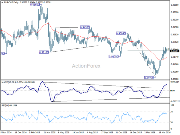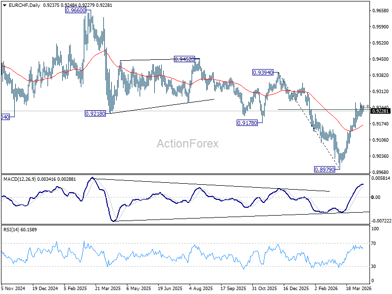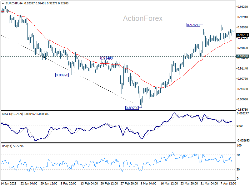 Intraday bias in EUR/CHF stays neutral and more consolidations could be seen below 0.9264. On the upside, sustained trading above 61.8% retracement of 0.9394 to 0.8979 at 0.9235 will pave the way to 0.9394 key resistance next. However, break of 0.9155 support will turn bias back to the downside for 0.8979 low.