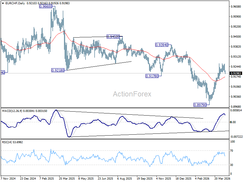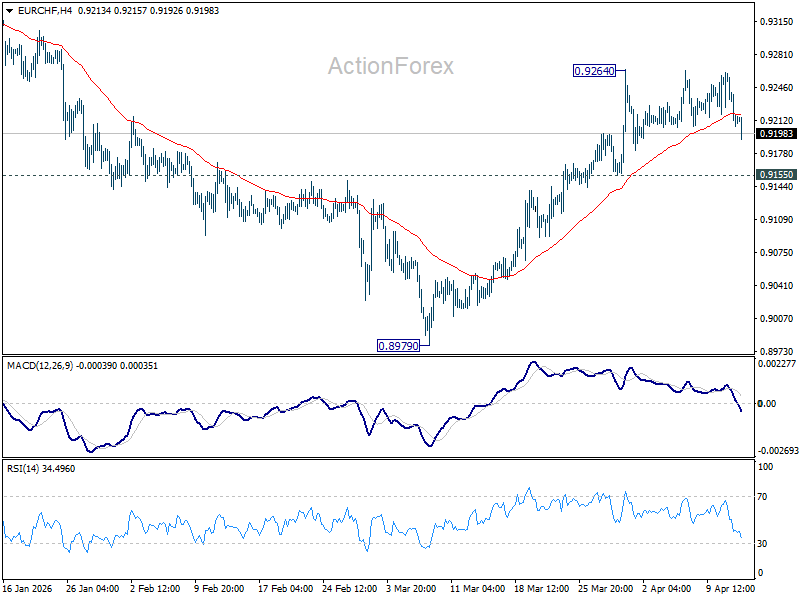 EUR/CHF is extending consolidation from 0.9264 with another fall, and intraday bias stays neutral. Further rise is expected with 0.9155 support intact. Firm break of 0.9264 will resume the rebound from 0.8979 to 0.9394 resistance next. However, break of 0.9155 will turn bias back to the downside for deeper pullback.