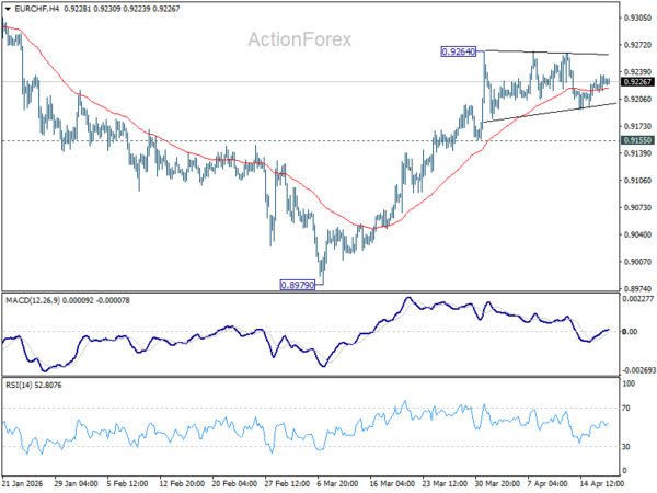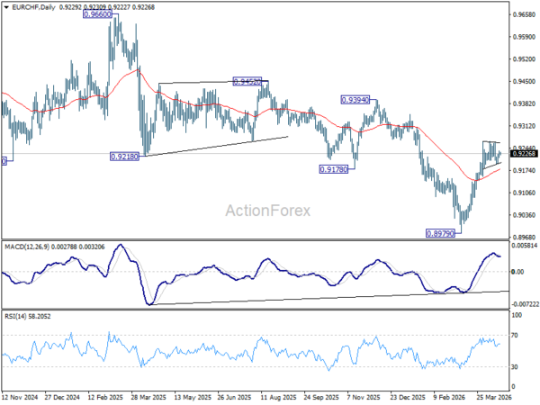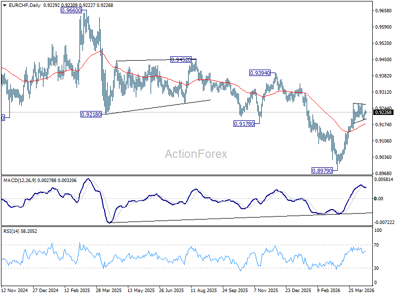 Sideway trading continues in EUR/CHF and intraday bias remains neutral. Further rise is expected with 0.9155 support intact. Firm break of 0.9264 will resume the rebound from 0.8979 to 0.9394 resistance next. However, break of 0.9155 will turn bias back to the downside for deeper pullback.