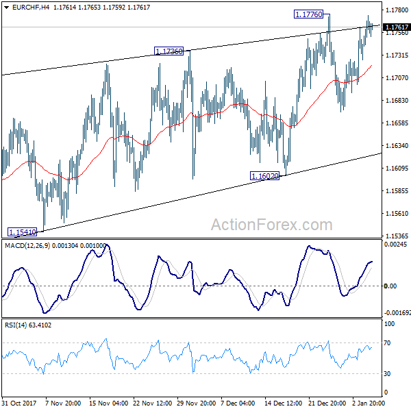 Intraday bias in EUR/CHF stays neutral with 1.1776 resistance intact. Medium term rally could still extend. But we’d maintain that the cross is close to topping. And in case of another rise, strong resistance should be seen well below 1.2 handle to bring medium term reversal. On the downside, break of 1.1602 support will indicate reversal and turn outlook bearish for 1.1387 and below.