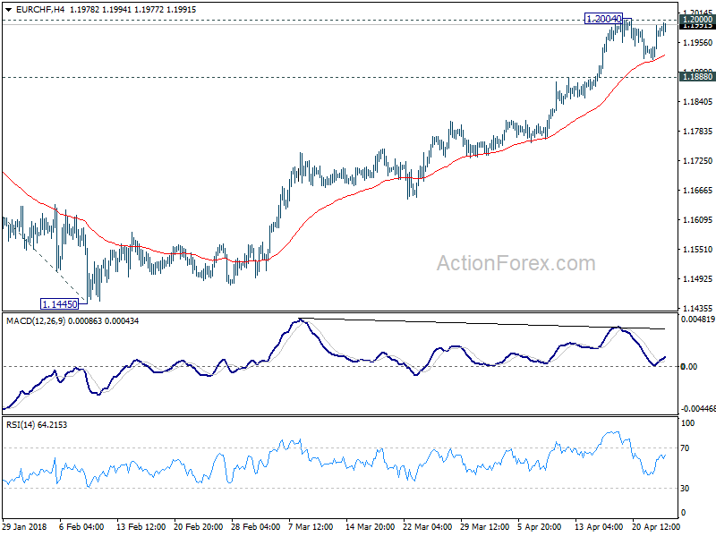 EUR/CHF recovered strongly, but it’s still staying below 1.2004 temporary top. Intraday bias remains neutral first. Consolidation could extend but should be relatively brief as long as 1.1888 minor support holds. Decisive break of 1.2 will pave the way to 61.8% projection of 1.0629 to 1.1832 from 1.1445 at 1.2188. However, considering bearish divergence condition in 4 hour MACD, break of 1.1888 will indicate short term topping. In that case, deeper pull back would be seen back to 1.1445/1832 support zone.