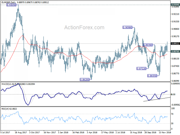 EUR/GBP’s late break of 0.8939 resistance suggests that fall from 0.9098 has completed at 0.8655 already. Initial bias is now on the upside this week for 0.9098 first. Sustained break will target 0.9304 key resistance next. On the downside, break of 0.8876 minor support will mix up near term outlook and turn intraday bias neutral first.