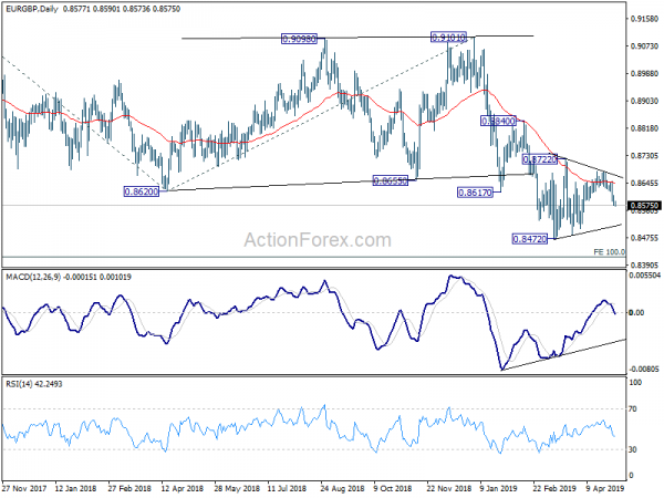 EUR/GBP is staying in consolidation from 0.8472 and intraday bias remains neutral. In case of another rise, upside should be limited by 0.8722 resistance. On the downside, firm break of 0.8472 will resume larger down trend for 0.8416 long term projection next. On the upside, though, sustained break of 0.8722 will suggest near term reversal and bring stronger rise back to 0.8840 resistance and above.