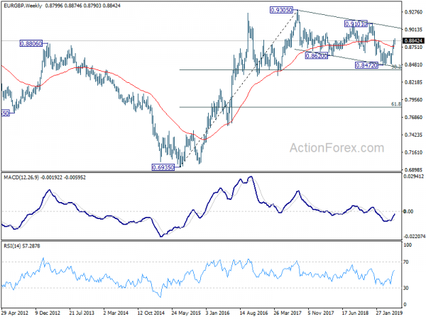 In the bigger picture, medium term decline from 0.9305 (2017 high) is seen as a corrective move. No change in this view. Current development argues that it might have completed with three waves down to 0.8472, just ahead of 38.2% retracement of 0.6935 (2015 low) to 0.9306 at 0.8400, after hitting 55 month EMA (now at 0.8511). Decisive break of 0.9101 resistance will confirm this bullish case. Nevertheless, as EUR/GBP is still staying inside long term falling channel, correction from 0.9305 could still extend to 0.8400 fibonacci level before completion.