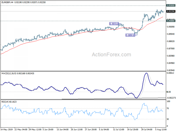 No change in EUR/GBP’s outlook. With 0.9088 minor support intact, further rise is expected. Current rally should now target 0.9305 key resistance next. On the downside, break of 0.9088 minor support will turn intraday bias neutral again to bring consolidations, before staging another rise.