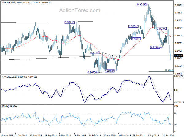 Intraday bias in EUR/GBP remains on the downside with 0.8811 minor resistance intact. Current fall from 0.9324 is still in progress and would target 100% projection of 0.9324 to 0.8786 from 0.9019 at 0.8481. However, break of 0.8811 will turn intraday bias neutral and bring more consolidations. But recovery should be limited below 0.9019 resistance to bring another decline.