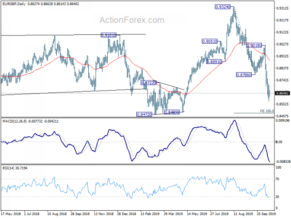 A temporary low should be in place at 0.8575 with 4 hour MACD staying well above signal line. Intraday bias is turned neutral for some consolidations first. Upside of recovery should be limited below 0.9019 resistance to bring fall resumption. On the downside, break of 0.8575 will extend the decline from 0.9324 to 100% projection of 0.9324 to 0.8786 from 0.9019 at 0.8481.