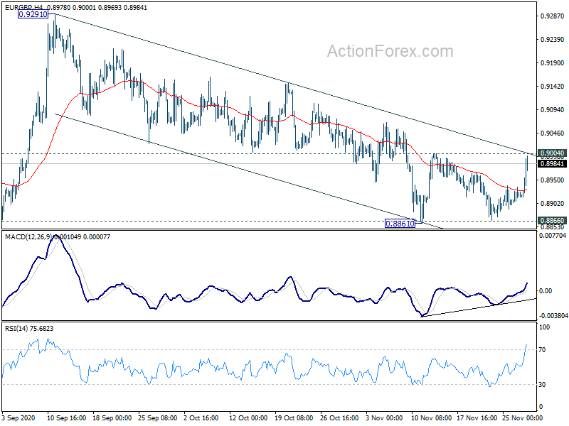 EUR/GBP was supported by 0.8866 structural support again last week and rebounded. Though, upside is limited below 0.9004 resistance so far. Initial bias stays neutral this week first. On the upside, firm break of 0.9004 and the falling channel resistance will firstly indicate short term bottoming. Secondly, pull back from 0.9291 should have completed. Thirdly, with 0.8866 support intact, rise from 0.8276 isn’t over. Intraday bias will be turned back to the upside for 0.9291 resistance in this case. On the downside, however, sustained break of 0.8866 will extend the pattern from 0.9499 with another falling leg to 0.8670 and possibly below.