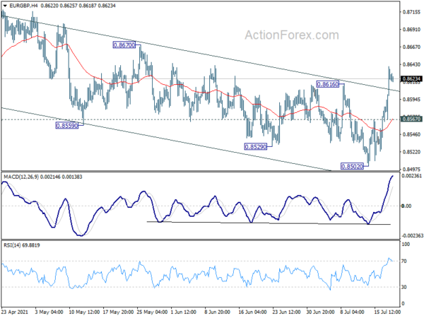 Intraday bias in EUR/GBP remains on the upside for 0.8670 resistance first. Break there will affirm the case that whole rebound from 0.8470 is resuming through 0.8718 resistance. On the downside, though, break of 0.8567 minor support will turn intraday bias neutral again first.