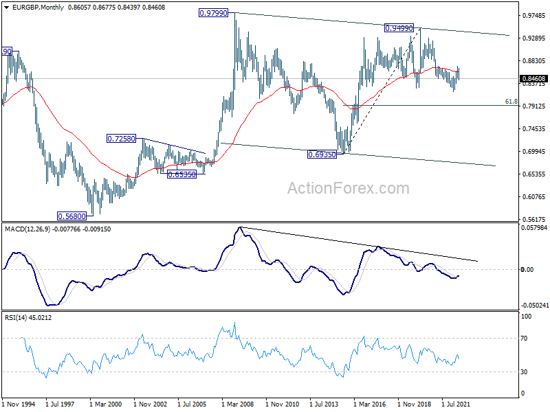 In the long term picture, the lack of medium term downside momentum suggests that fall from 0.9499 (2020 high) is merely a correction to rise from 0.6935 (2015 high). In case of another fall, downside should be contained by 61.8% retracement of 0.6935 to 0.9499 at 0.7917 to bring rebound. Sustained trading above 55 month EMA (now at 0.8604) will indicate that the correction has completed and bring retest of 0.9499.