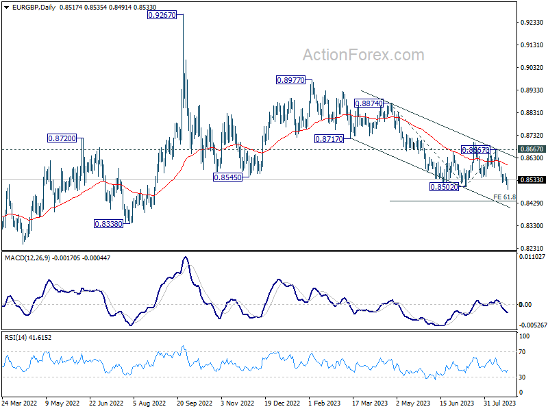 In the bigger picture, the down trend from 0.9267 (2022 high) is seen as part of the long term range pattern from 0.9499 (2020 high). Further decline is in favor as long as 0.8667 resistance holds. Break of 0.8502 will resume the fall towards 0.8201 (2022 low).