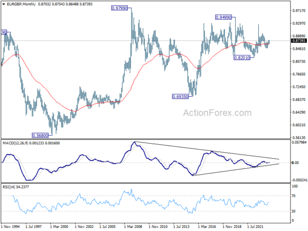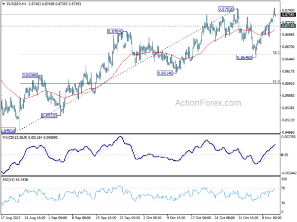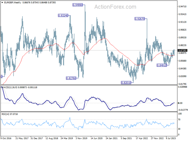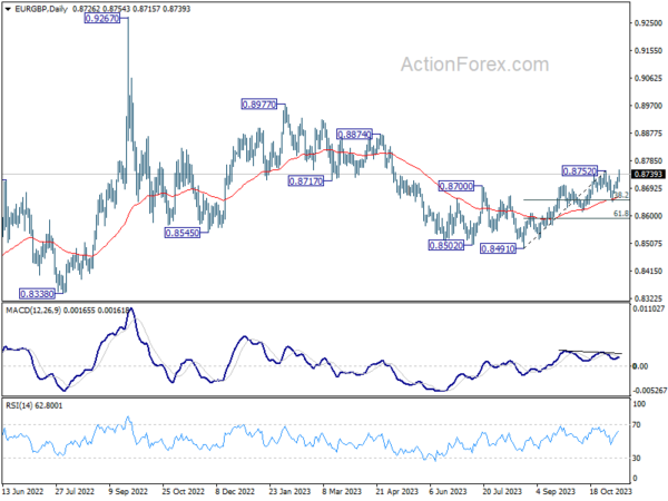EUR/GBP’s strong rebound last week suggests that correction from 0.8752 has completed at 0.8648, after hitting 38.2% retracement of 0.8491 to 0.8752 at 0.8652. Initial focus is on 0.8752 resistance this week. Decisive break there will resume larger up trend and target 0.8874 resistance next. On the downside, below 0.8715 minor support will extend the corrective pattern with another falling leg before completion.